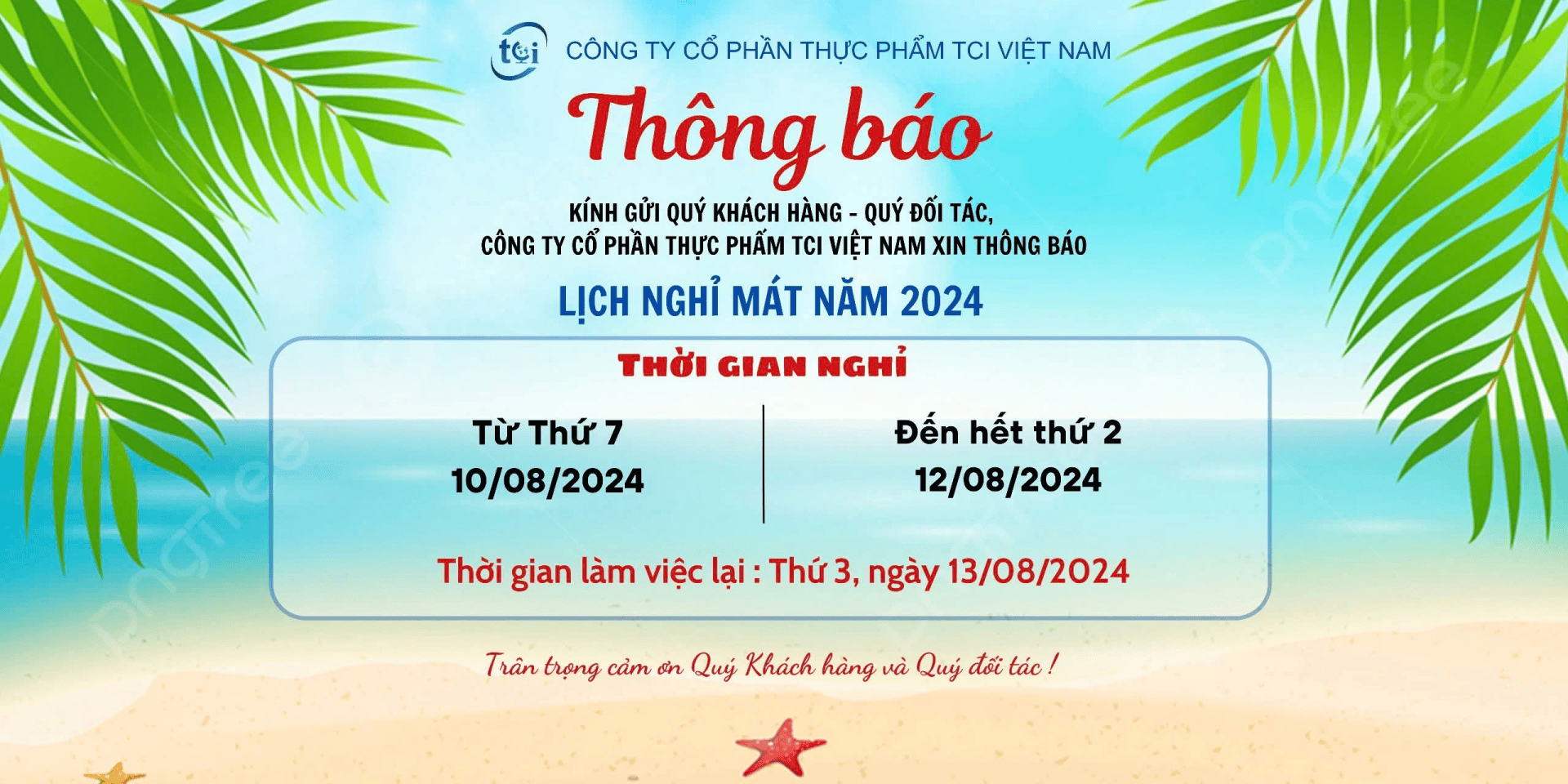 Công ty Cổ phần Thực phẩm TCI Việt Nam xin thông báo tới Quý khách hàng, Quý đối tác về lịch nghỉ mát năm 2024 từ ngày 10/8/2024 - 12/8/2024.